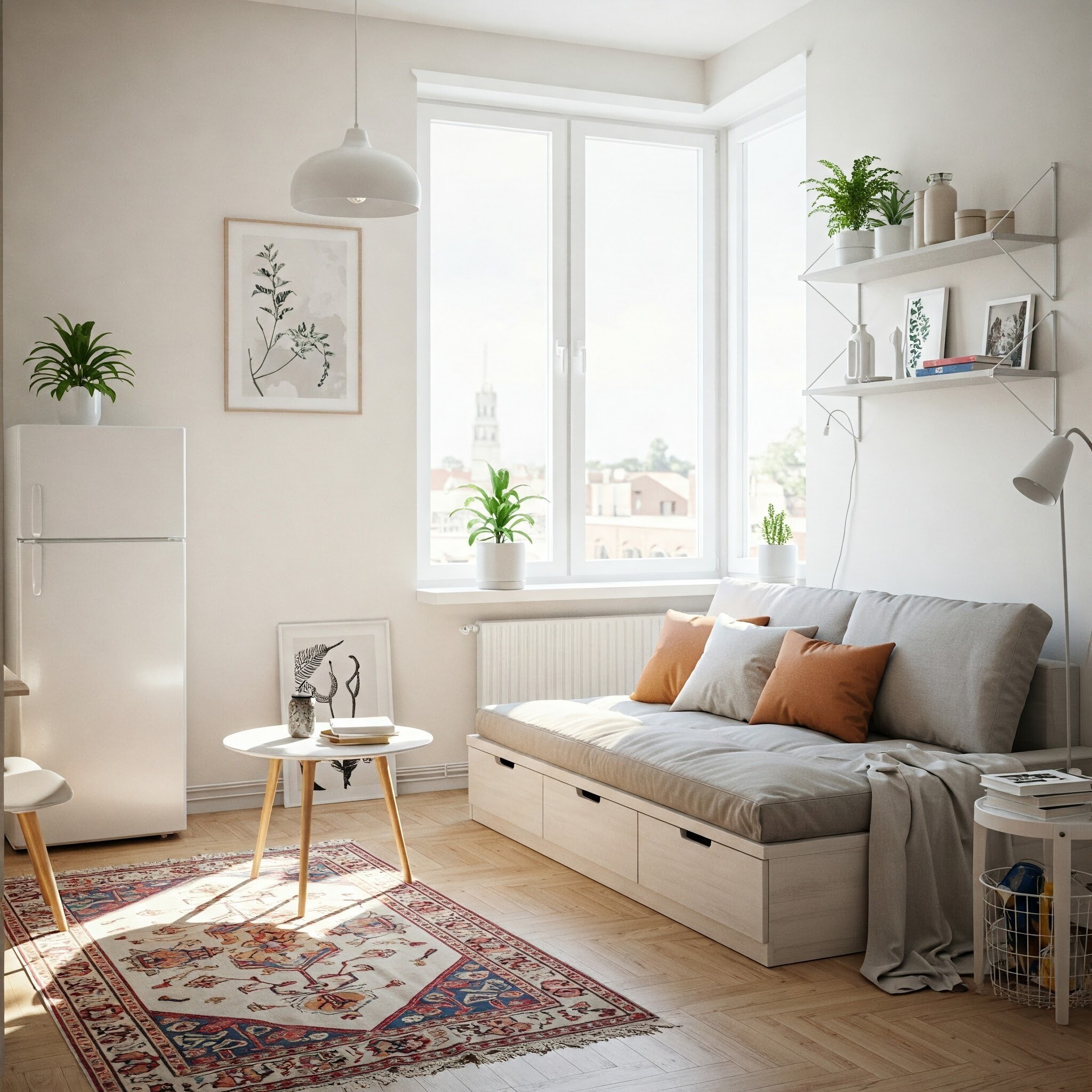 One of the key challenges in a studio is creating distinct areas for living, sleeping, dining, and working. Instead of walls, use clever visual dividers such as: